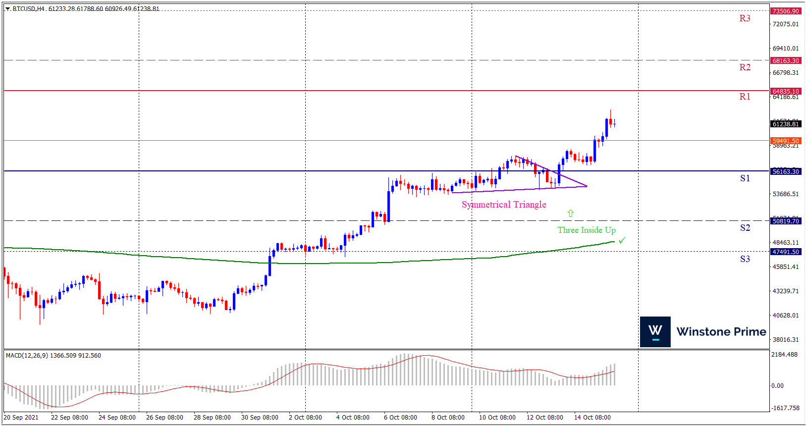 In the upcoming week we expect BTC/USD to show a bullish trend. The Instrument is trading above the 200 Simple Moving Average and the MACD trades to the upside. A solid breakout above 64835.1 may open a clean path towards 68163.3 and then may take a way up to 73506.9. Should 56163.3 prove to be unreliable support, the BTCUSD may fall downwards to 50819.7 and 47491.5 respectively. In H4 chart symmetrical triangle breakout created prospects of a bullish trend. Three inside up pattern constructs a bullish outlook for the pair in the upcoming week.