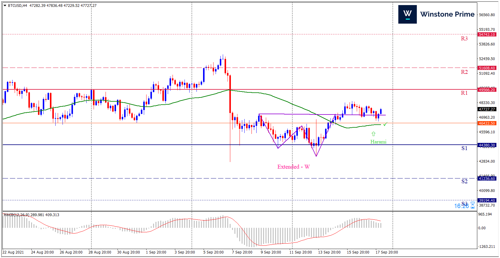 In the upcoming week we expect BTC/USD to show a bullish trend. The Instrument is trading above the 50 Simple Moving Average and the MACD trades to the upside. A solid breakout above 49566.2 may open a clean path towards 51608.4 and may take a way up to 54752.1. Should 44380.3 prove to be unreliable support, the BTCUSD may sink downwards 41236.6 and 39194.4 respectively. In H4 chart Extended-W pattern formation favors prospects of a bullish trend. Bullish harami pattern constructs a bullish outlook for the pair in the upcoming week.