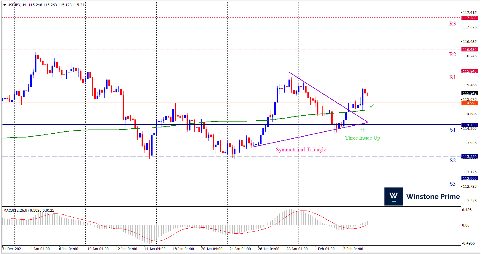 In the upcoming week we expect USD/JPY to show a bullish trend. The currency pair is trading above the 200 Simple Moving Average and the MACD trades to the upside. A solid breakout above 115.84 may open a clean path towards 116.43 and may take a way up to 117.28. Should 114.40 prove to be unreliable support, the USDJPY may sink downwards 113.55 and 112.96 respectively. In H4 chart symmetrical triangle pattern breakout upside favors prospects of a bullish trend. Also to be noted three inside up formation exerts the expectation of uptrend for the pair.